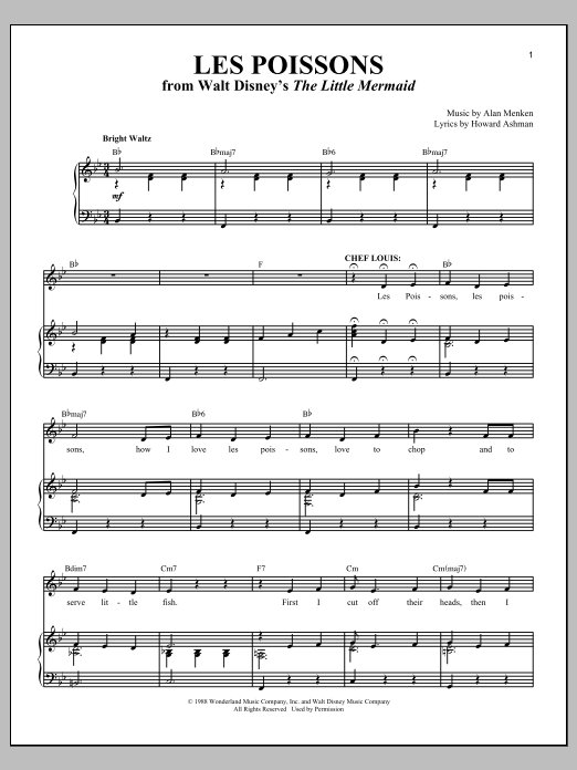 Download or print Howard Ashman Les Poissons (from The Little Mermaid) sheet music, chords and digital score arranged for Easy Lead Sheet / Fake Book. This Children score includes 3 page(s).