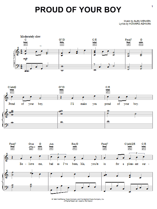 Download or print Alan Menken Proud Of Your Boy (from Aladdin) sheet music, chords and digital score arranged for Piano & Vocal. This Children score includes 6 page(s).