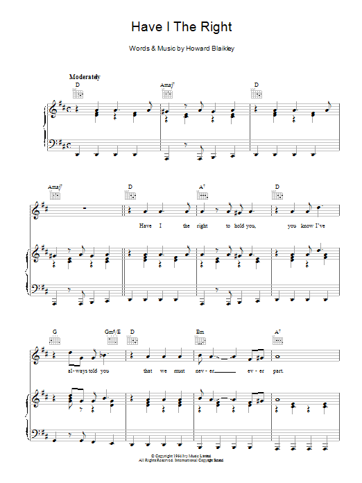 Download or print Howard Blaikley Have I The Right sheet music, chords and digital score arranged for Piano, Vocal & Guitar Chords. This Pop score includes 4 page(s).