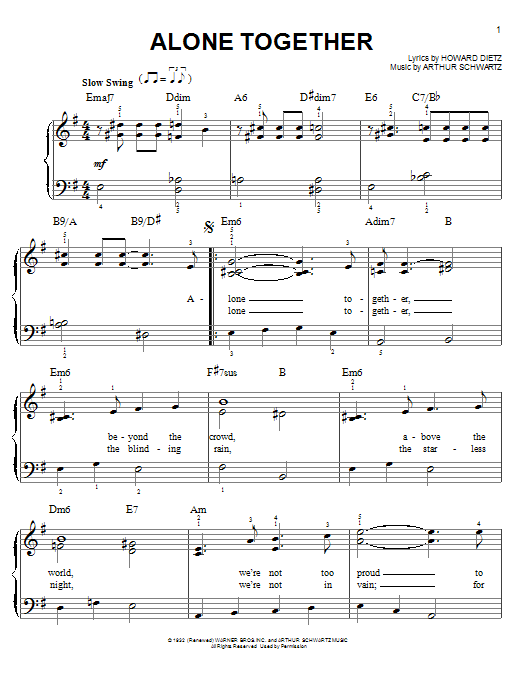 Download or print Howard Dietz Alone Together sheet music, chords and digital score arranged for Piano, Vocal & Guitar Chords (Right-Hand Melody). This Jazz score includes 4 page(s).