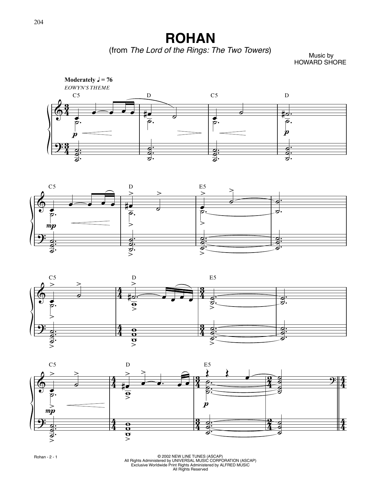 Download or print Howard Shore Rohan (from The Lord Of The Rings: The Two Towers) sheet music, chords and digital score arranged for Piano Solo. This Film/TV score includes 2 page(s).