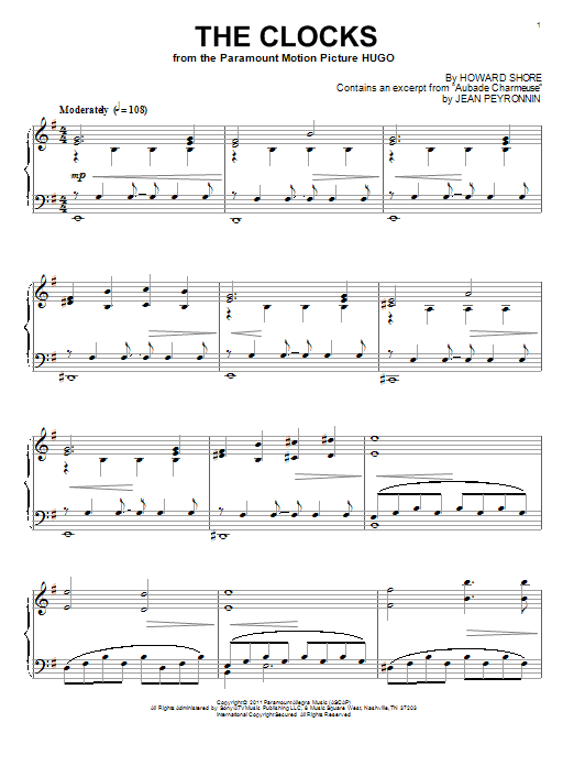 Download or print Howard Shore The Clocks sheet music, chords and digital score arranged for Piano Solo. This Children score includes 9 page(s).