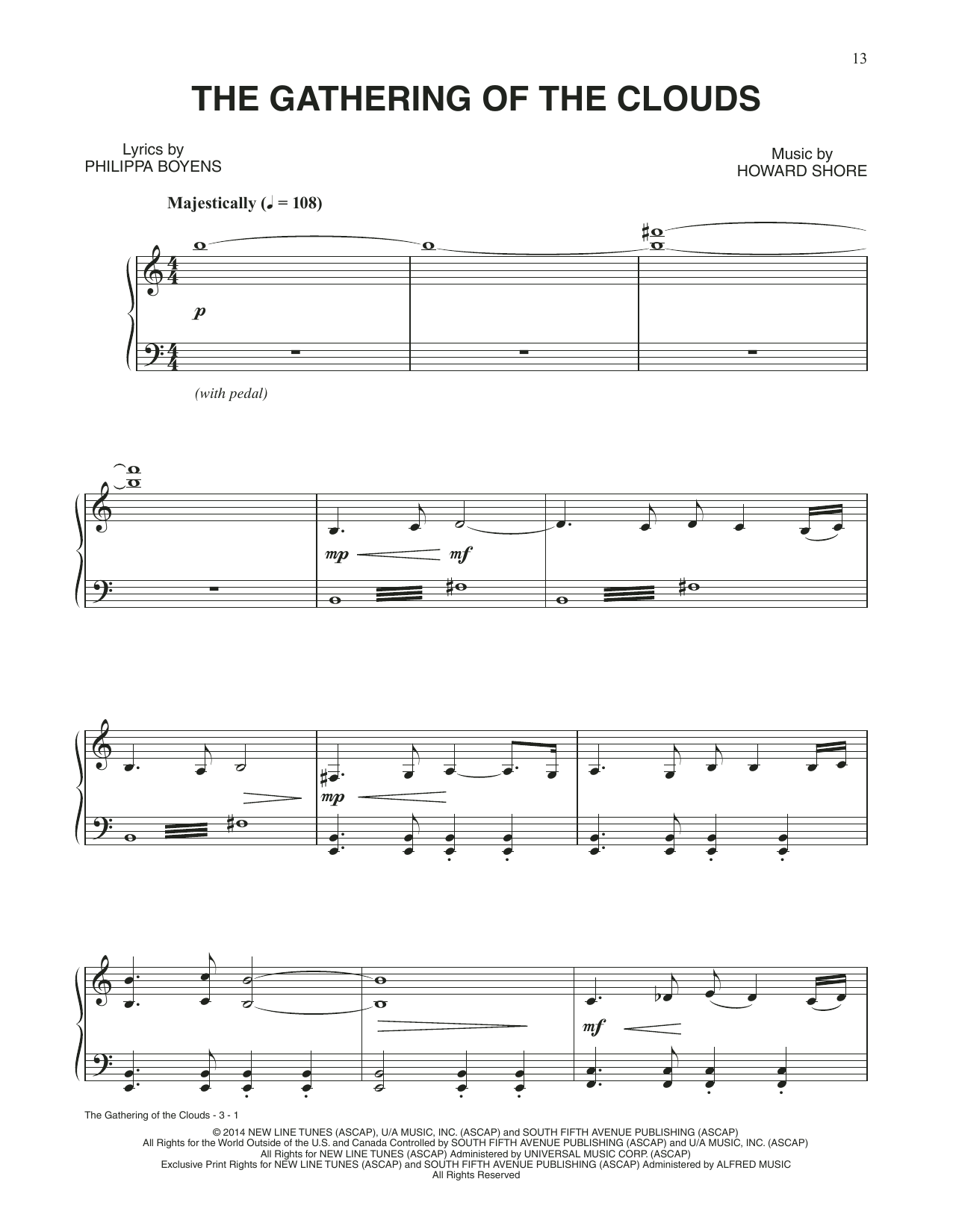 Download or print Howard Shore The Gathering Of The Clouds (from The Hobbit: The Battle of the Five Armies) sheet music, chords and digital score arranged for Piano Solo. This Film/TV score includes 3 page(s).