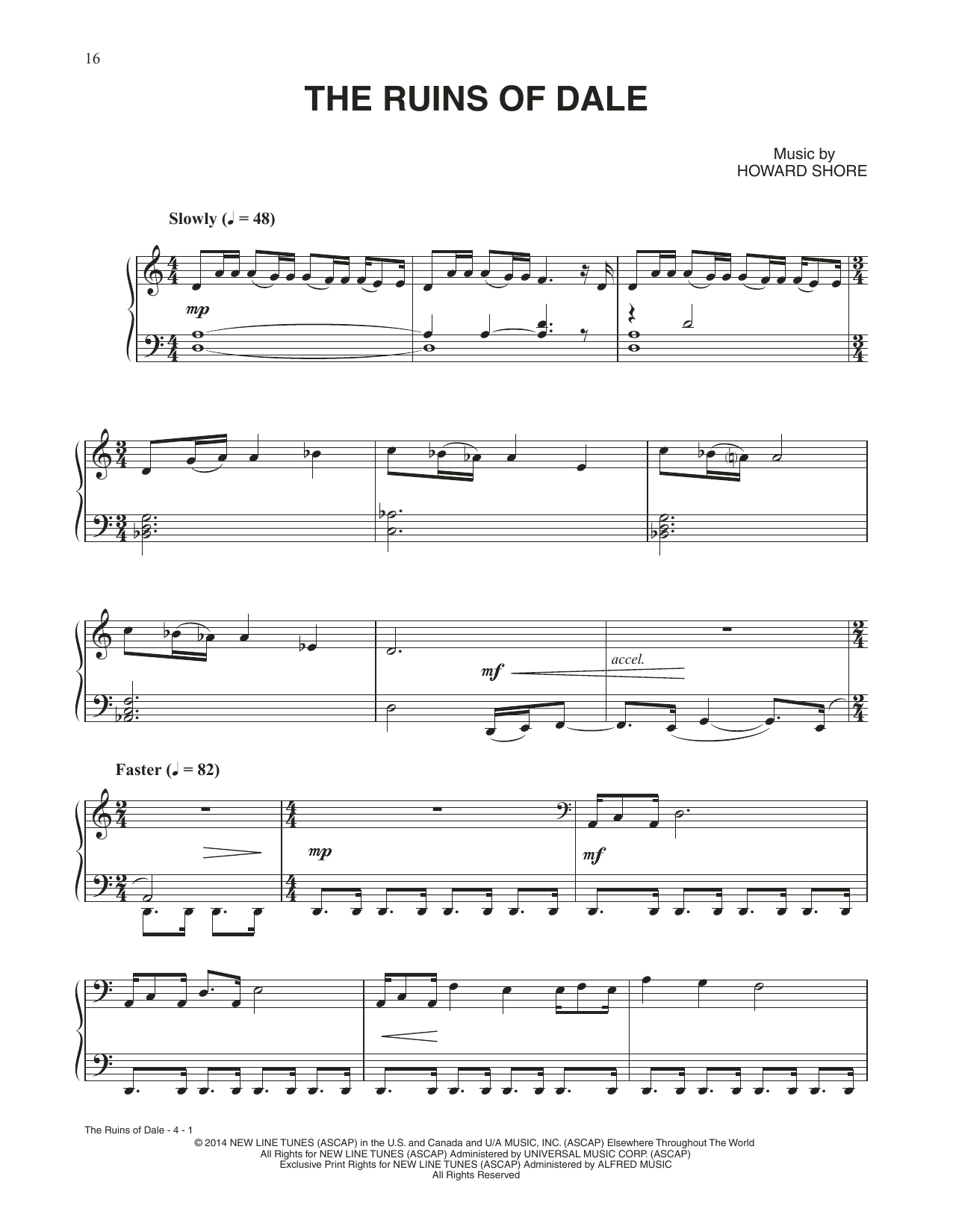 Download or print Howard Shore The Ruins Of Dale (from The Hobbit: The Battle of the Five Armies) sheet music, chords and digital score arranged for Piano Solo. This Film/TV score includes 4 page(s).