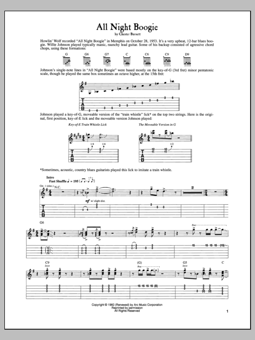 Download or print Howlin' Wolf All Night Boogie sheet music, chords and digital score arranged for Guitar Tab. This Blues score includes 6 page(s).
