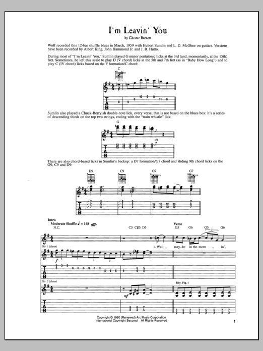 Download or print Howlin' Wolf I'm Leavin' You sheet music, chords and digital score arranged for Guitar Tab. This Blues score includes 8 page(s).