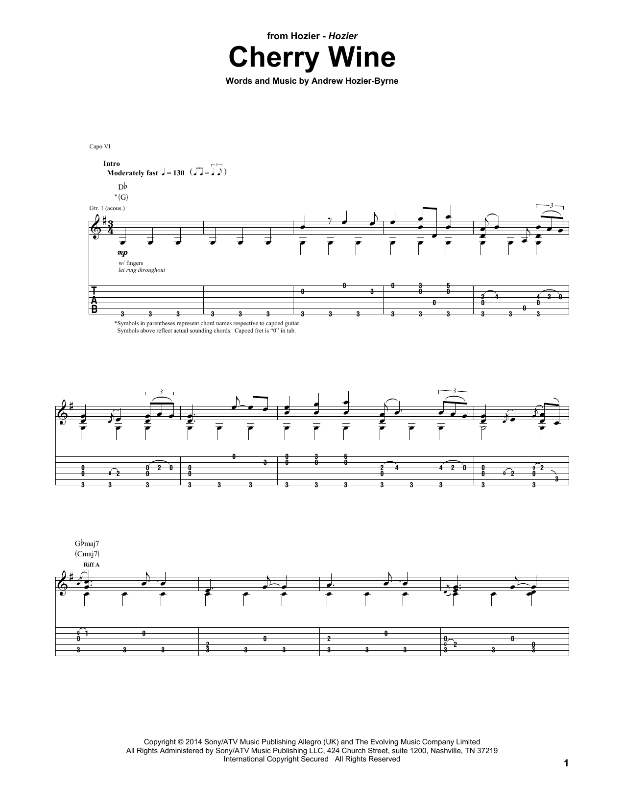Download or print Hozier Cherry Wine sheet music, chords and digital score arranged for Guitar Tab. This Pop score includes 7 page(s).