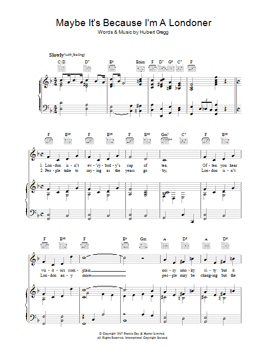 Download or print Hubert Gregg Maybe It's Because I'm A Londoner sheet music, chords and digital score arranged for Piano, Vocal & Guitar Chords. This Pop score includes 3 page(s).