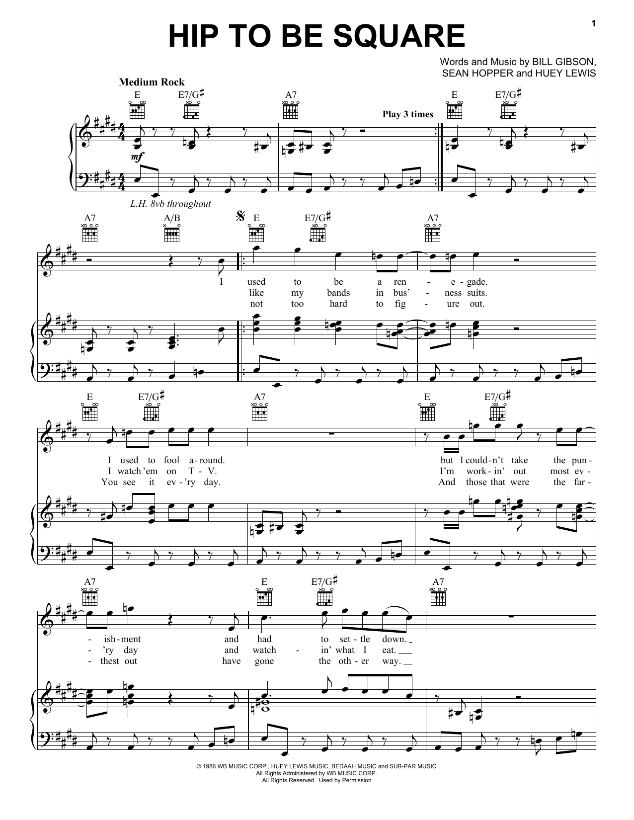 Download or print Huey Lewis & The News Hip To Be Square sheet music, chords and digital score arranged for Piano, Vocal & Guitar Chords (Right-Hand Melody). This Pop score includes 5 page(s).