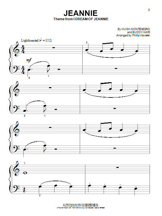 Download or print Hugh Montenegro Jeannie (arr. Phillip Keveren) sheet music, chords and digital score arranged for Beginning Piano Solo. This Film/TV score includes 2 page(s).