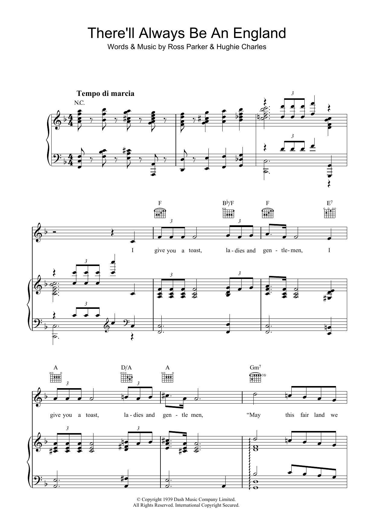 Download or print Hughie Charles There'll Always Be An England sheet music, chords and digital score arranged for Piano, Vocal & Guitar Chords. This Pop score includes 9 page(s).
