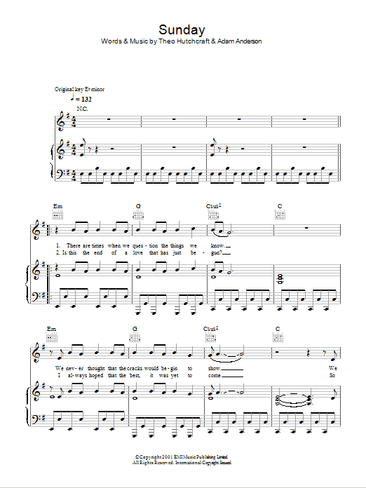 Download or print Hurts Sunday sheet music, chords and digital score arranged for Piano, Vocal & Guitar Chords. This Pop score includes 5 page(s).