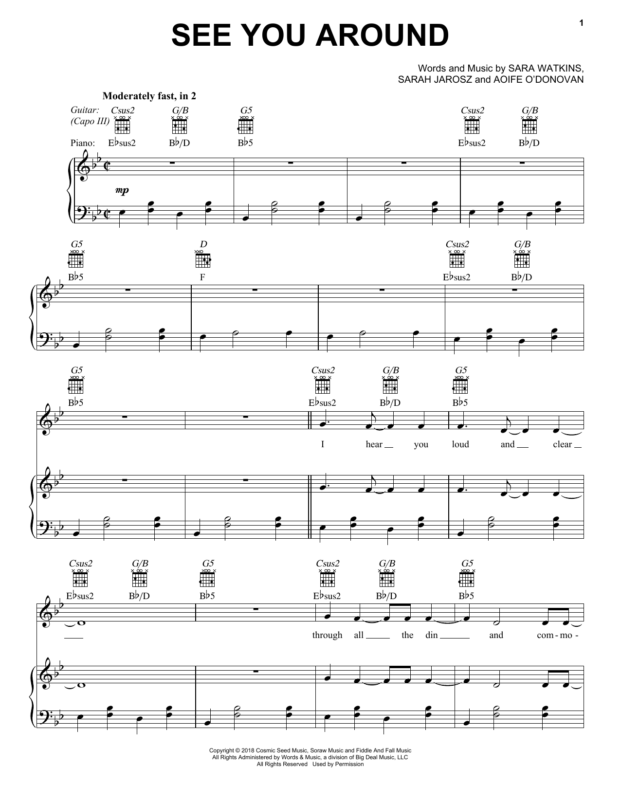 Download or print I'm With Her See You Around sheet music, chords and digital score arranged for Piano, Vocal & Guitar Chords (Right-Hand Melody). This Pop score includes 9 page(s).