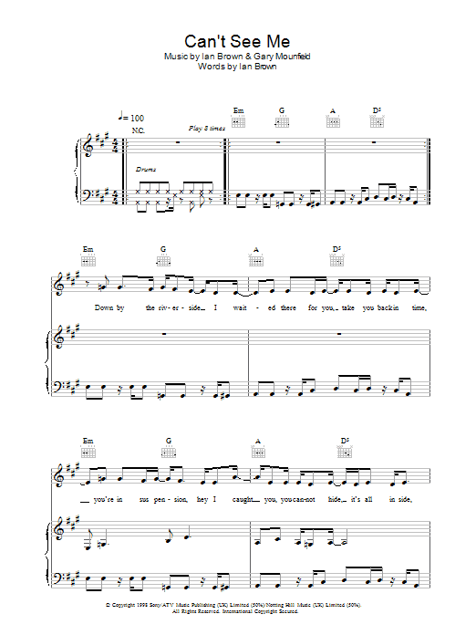Download or print Ian Brown Can't See Me sheet music, chords and digital score arranged for Piano, Vocal & Guitar Chords. This Rock score includes 10 page(s).