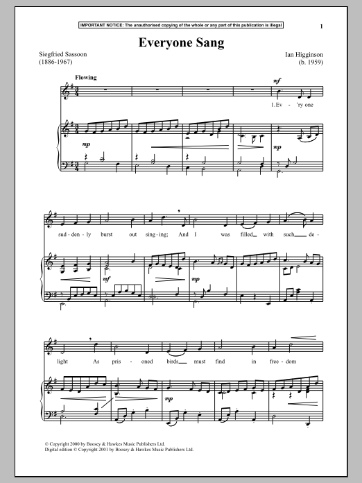 Download or print Ian Higginson Everyone Sang sheet music, chords and digital score arranged for Piano & Vocal. This Folk score includes 4 page(s).
