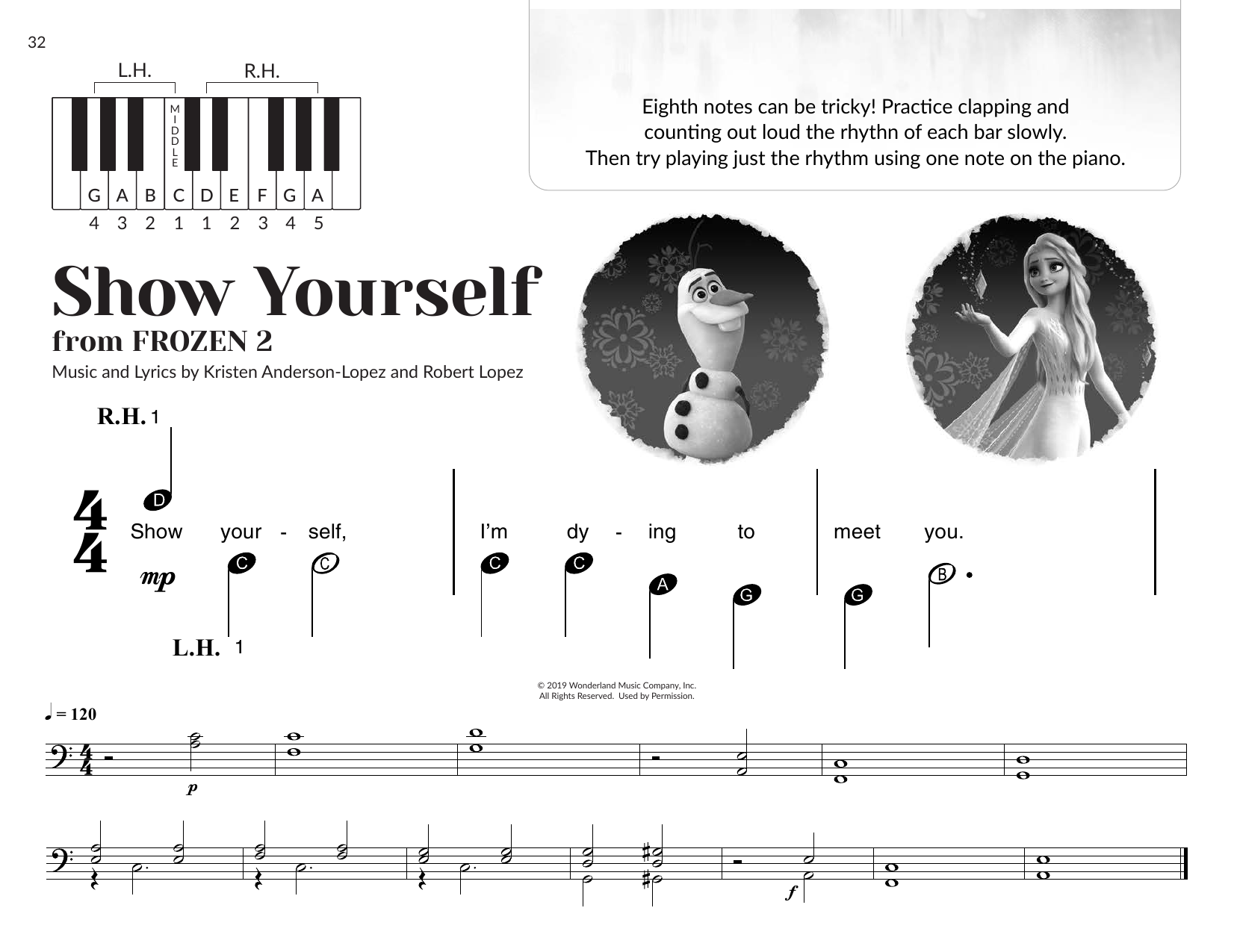 Download or print Idina Menzel and Evan Rachel Wood Show Yourself (from Frozen 2) sheet music, chords and digital score arranged for Very Beginner Piano. This Disney score includes 2 page(s).