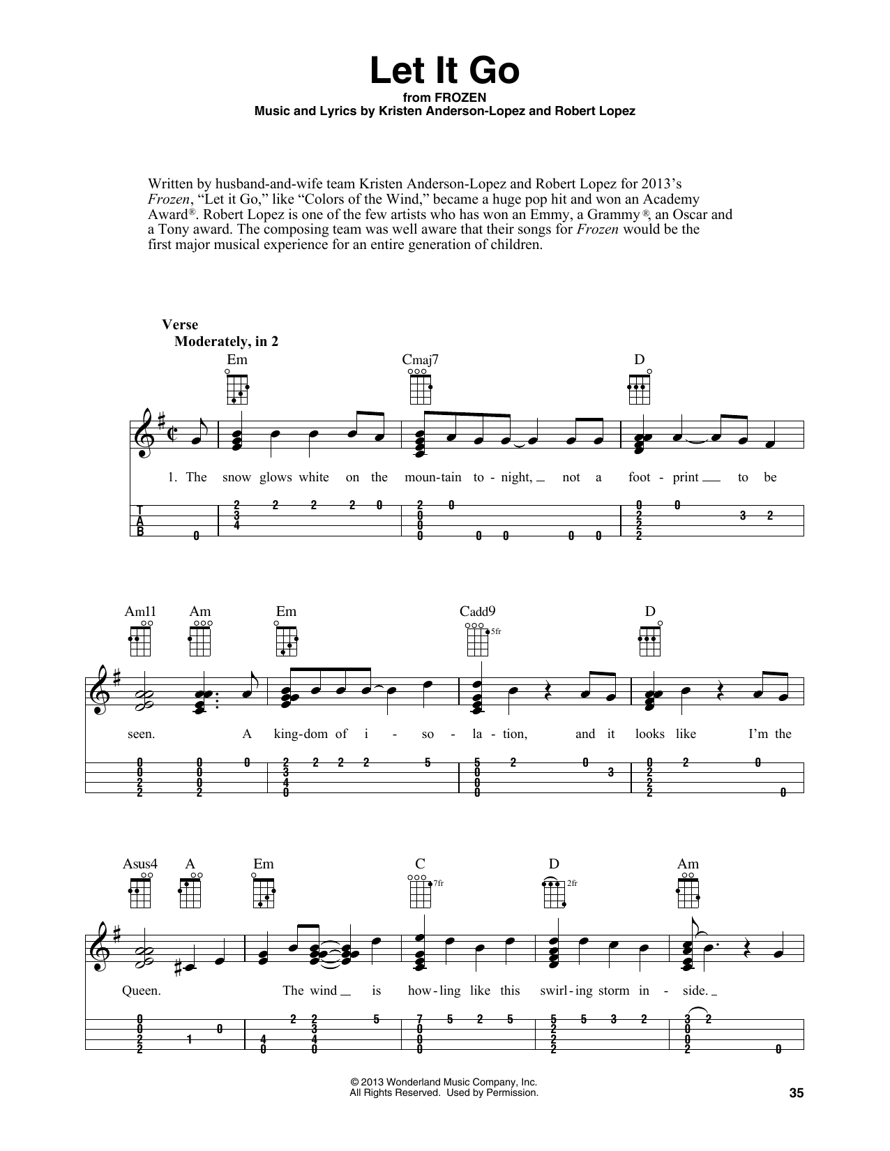 Download or print Idina Menzel Let It Go (from Frozen) (arr. Fred Sokolow) sheet music, chords and digital score arranged for Easy Ukulele Tab. This Disney score includes 7 page(s).