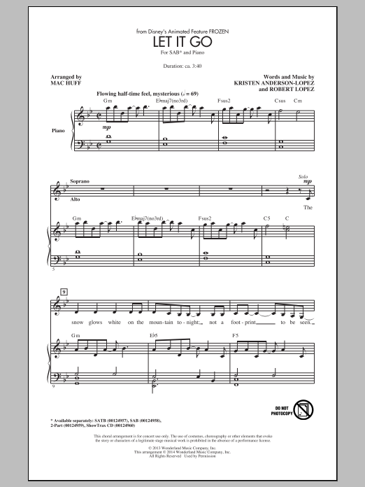 Download or print Idina Menzel Let It Go (from Frozen) (arr. Mac Huff) sheet music, chords and digital score arranged for SATB Choir. This Children score includes 3 page(s).