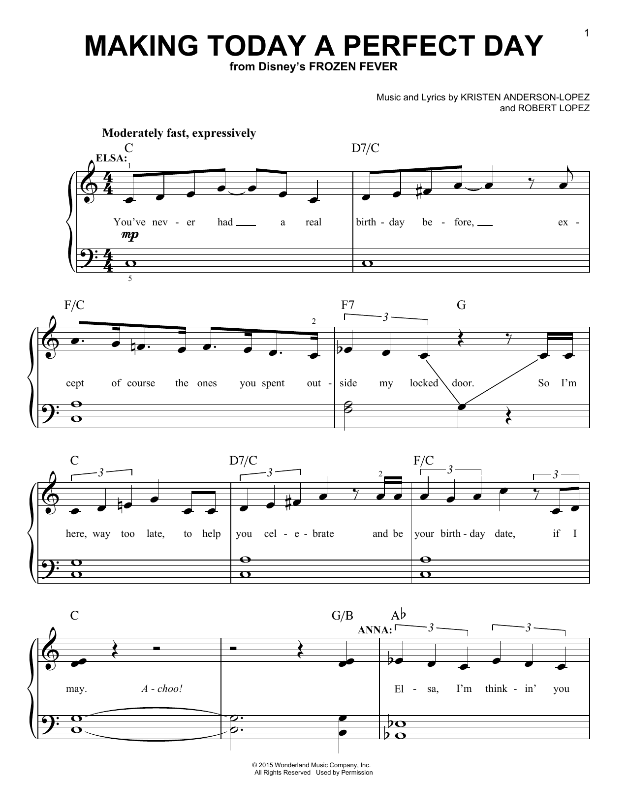 Download or print Idina Menzel & Kristen Bell and Cast Making Today A Perfect Day (from Frozen Fever) sheet music, chords and digital score arranged for Piano, Vocal & Guitar Chords (Right-Hand Melody). This Children score includes 12 page(s).