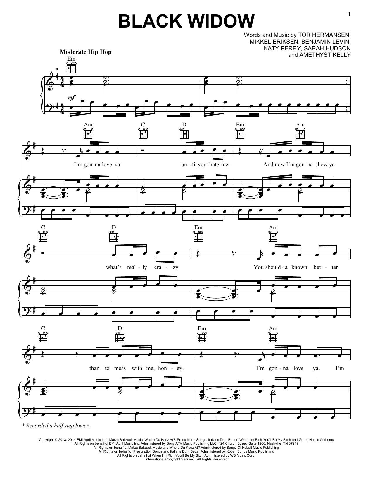 Download or print Iggy Azalea Featuring Rita Ora Black Widow sheet music, chords and digital score arranged for Piano, Vocal & Guitar Chords (Right-Hand Melody). This Pop score includes 5 page(s).