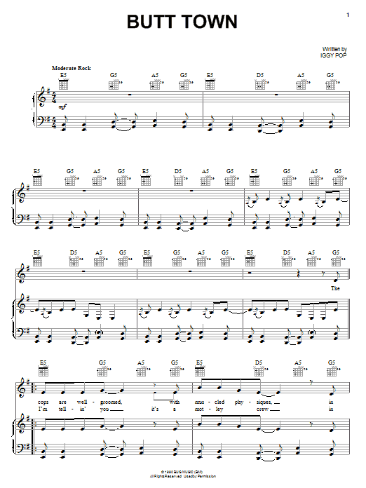 Download or print Iggy Pop Butt Town sheet music, chords and digital score arranged for Piano, Vocal & Guitar Chords (Right-Hand Melody). This Pop score includes 6 page(s).