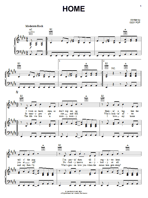 Download or print Iggy Pop Home sheet music, chords and digital score arranged for Piano, Vocal & Guitar Chords (Right-Hand Melody). This Pop score includes 4 page(s).