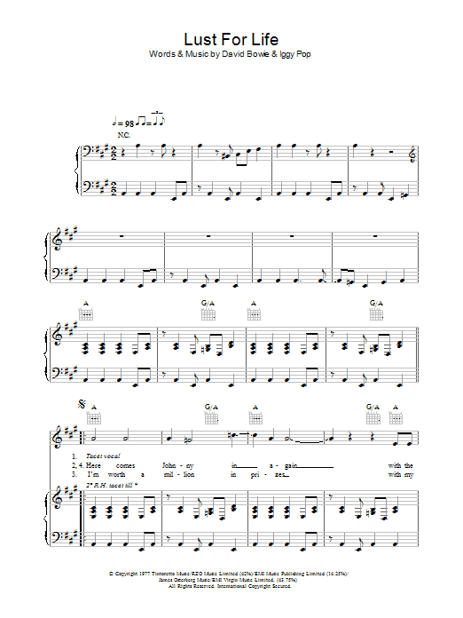 Download or print Iggy Pop Lust For Life sheet music, chords and digital score arranged for Guitar Chords/Lyrics. This Rock score includes 4 page(s).