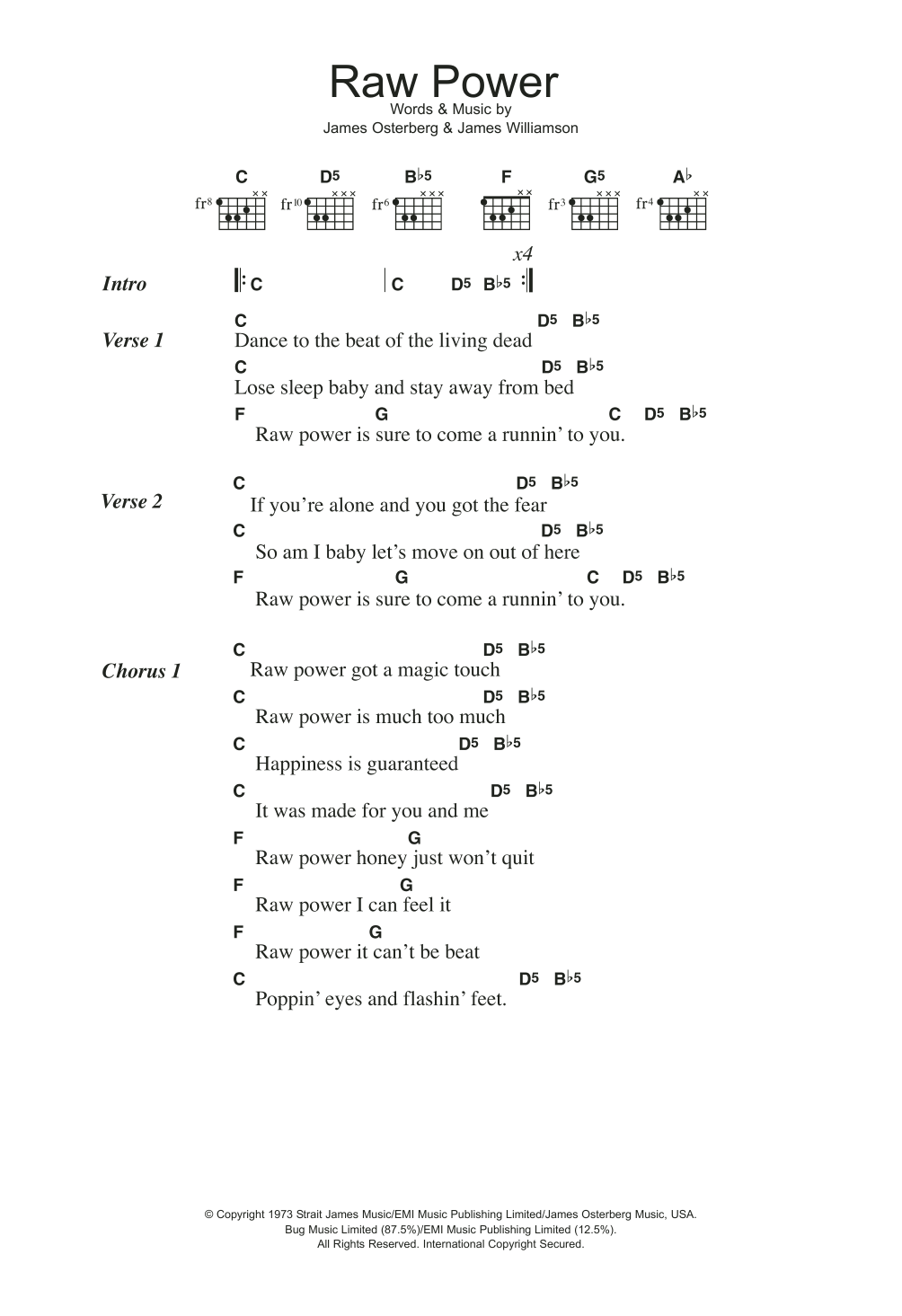 Download or print Iggy Pop Raw Power sheet music, chords and digital score arranged for Guitar Chords/Lyrics. This Rock score includes 3 page(s).