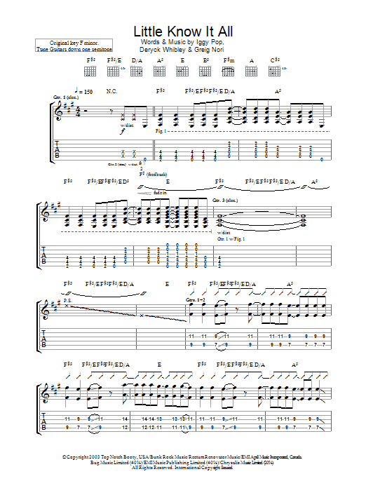 Download or print Iggy Pop & Sum 41 Little Know It All sheet music, chords and digital score arranged for Guitar Tab. This Metal score includes 7 page(s).