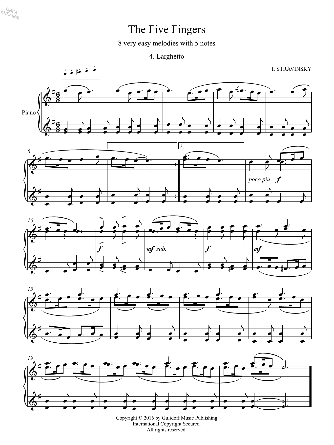 Download or print Igor Stravinsky Five Fingers: 4. Larghetto sheet music, chords and digital score arranged for Piano Solo. This Classical score includes 1 page(s).