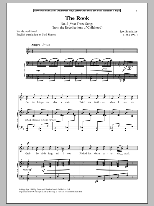 Download or print Igor Stravinsky The Rook (from The Recollections Of Childhood) sheet music, chords and digital score arranged for Piano & Vocal. This Classical score includes 2 page(s).