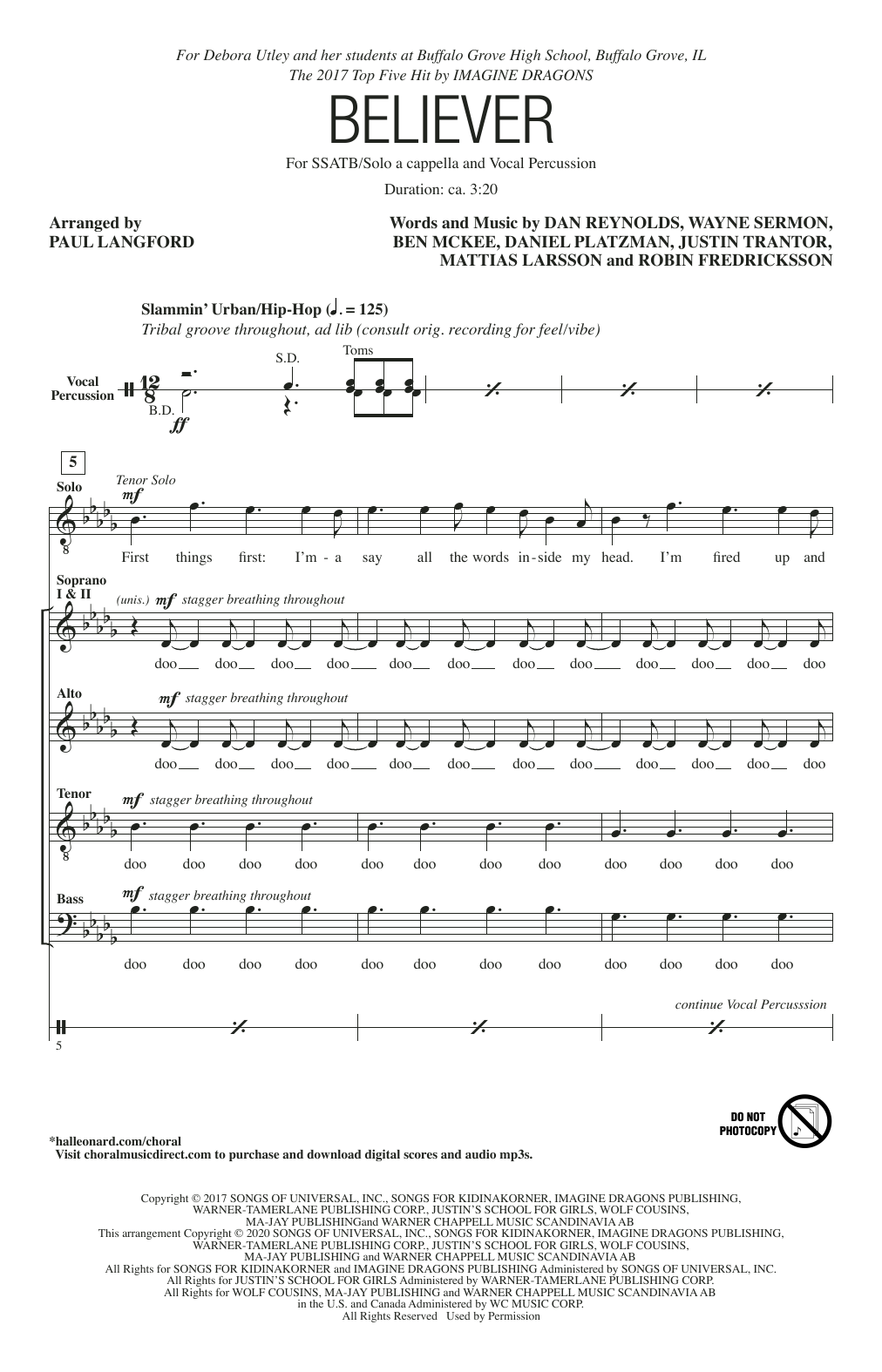 Download or print Imagine Dragons Believer (arr. Paul Langford) sheet music, chords and digital score arranged for SSATB Choir. This Pop score includes 19 page(s).