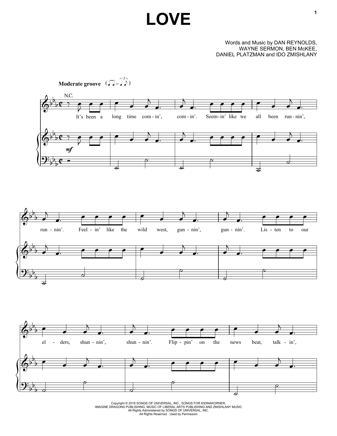 Download or print Imagine Dragons Love sheet music, chords and digital score arranged for Piano, Vocal & Guitar Chords (Right-Hand Melody). This Pop score includes 8 page(s).