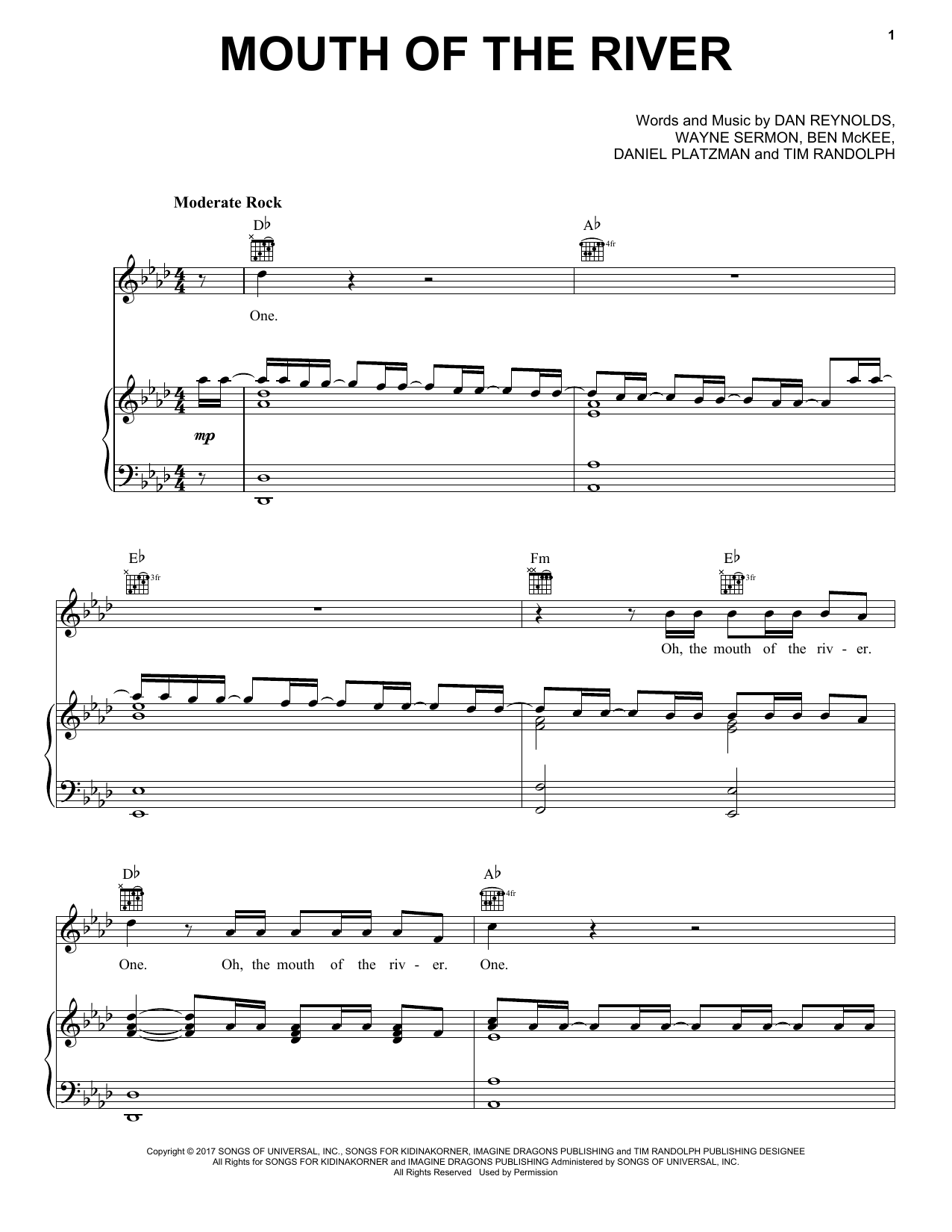 Download or print Imagine Dragons Mouth Of The River sheet music, chords and digital score arranged for Piano, Vocal & Guitar Chords (Right-Hand Melody). This Pop score includes 6 page(s).
