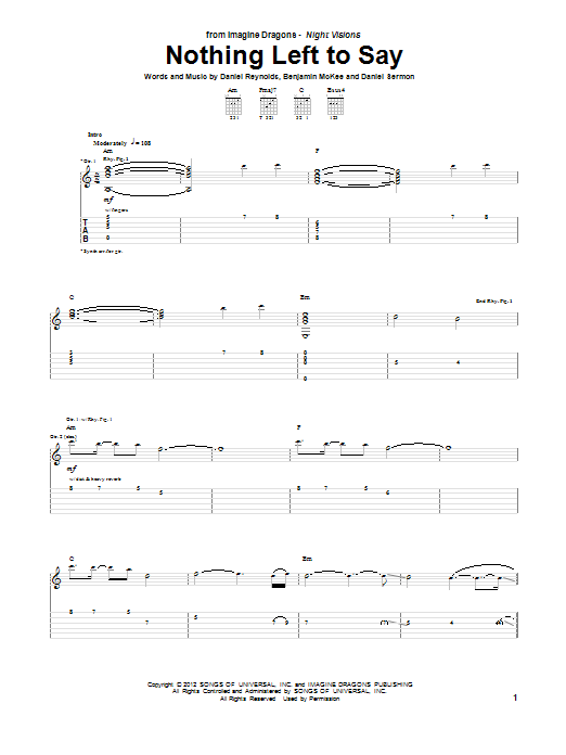 Download or print Imagine Dragons Nothing Left To Say sheet music, chords and digital score arranged for Guitar Tab. This Alternative score includes 9 page(s).