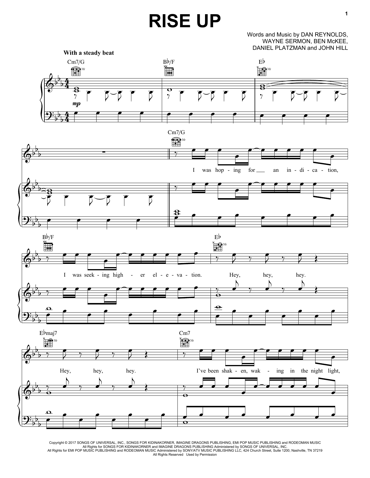 Download or print Imagine Dragons Rise Up sheet music, chords and digital score arranged for Piano, Vocal & Guitar Chords (Right-Hand Melody). This Pop score includes 7 page(s).