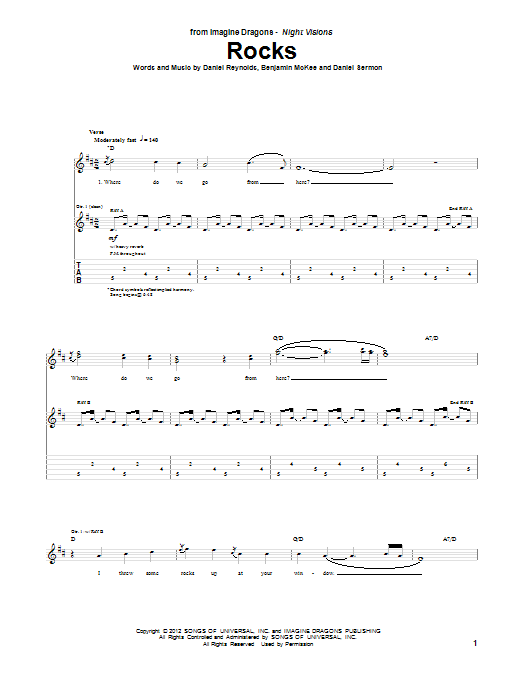 Download or print Imagine Dragons Rocks sheet music, chords and digital score arranged for Guitar Tab. This Alternative score includes 4 page(s).