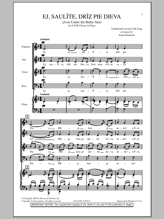 Download or print Imant Raminsh Ej, Saulite, Driz Pie Dieva sheet music, chords and digital score arranged for SATB Choir. This Concert score includes 8 page(s).