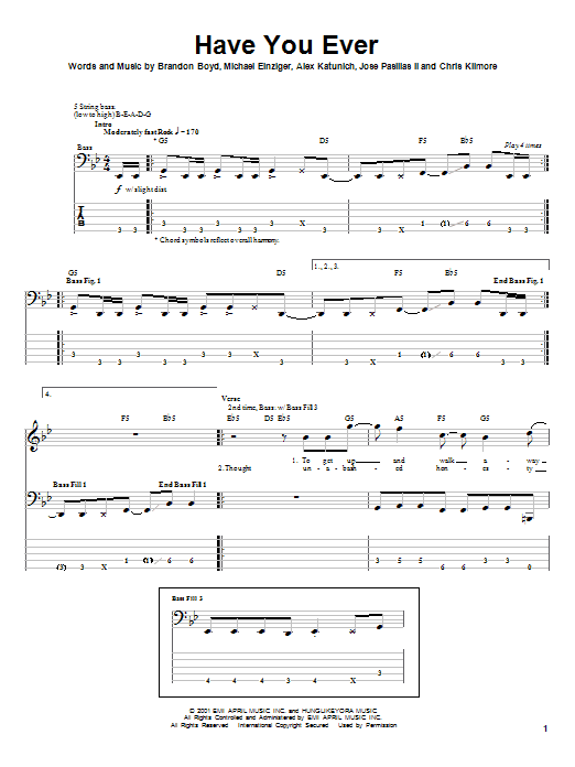 Download or print Incubus Have You Ever sheet music, chords and digital score arranged for Bass Guitar Tab. This Rock score includes 5 page(s).