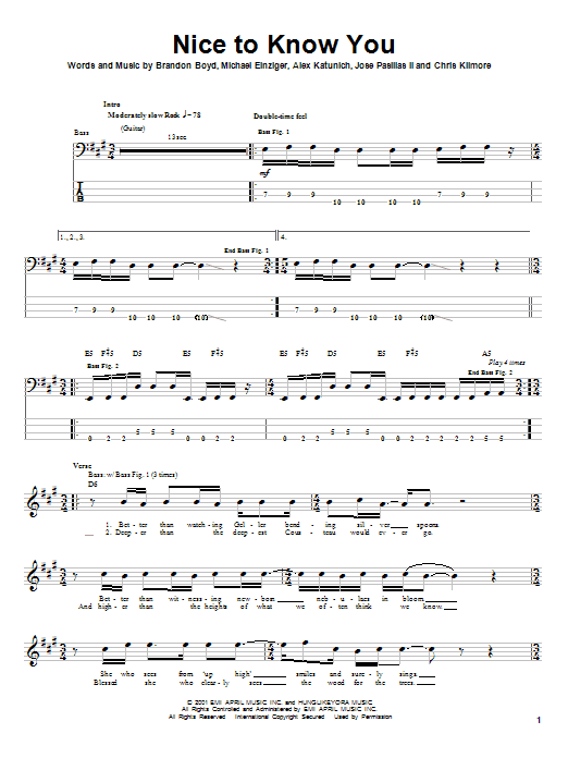 Download or print Incubus Nice To Know You sheet music, chords and digital score arranged for Bass Guitar Tab. This Alternative score includes 6 page(s).