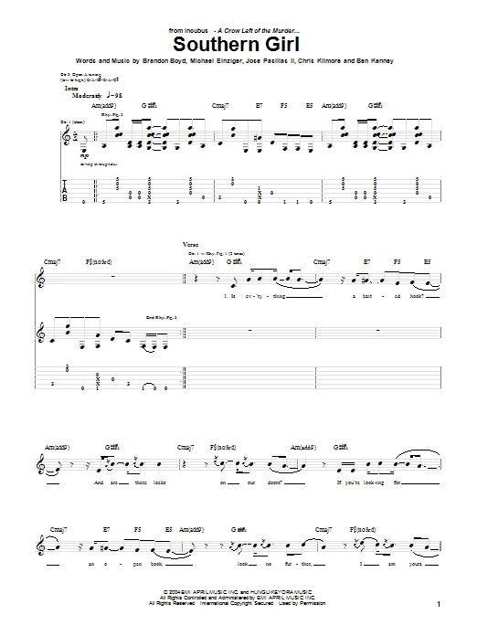 Download or print Incubus Southern Girl sheet music, chords and digital score arranged for Guitar Tab. This Rock score includes 7 page(s).