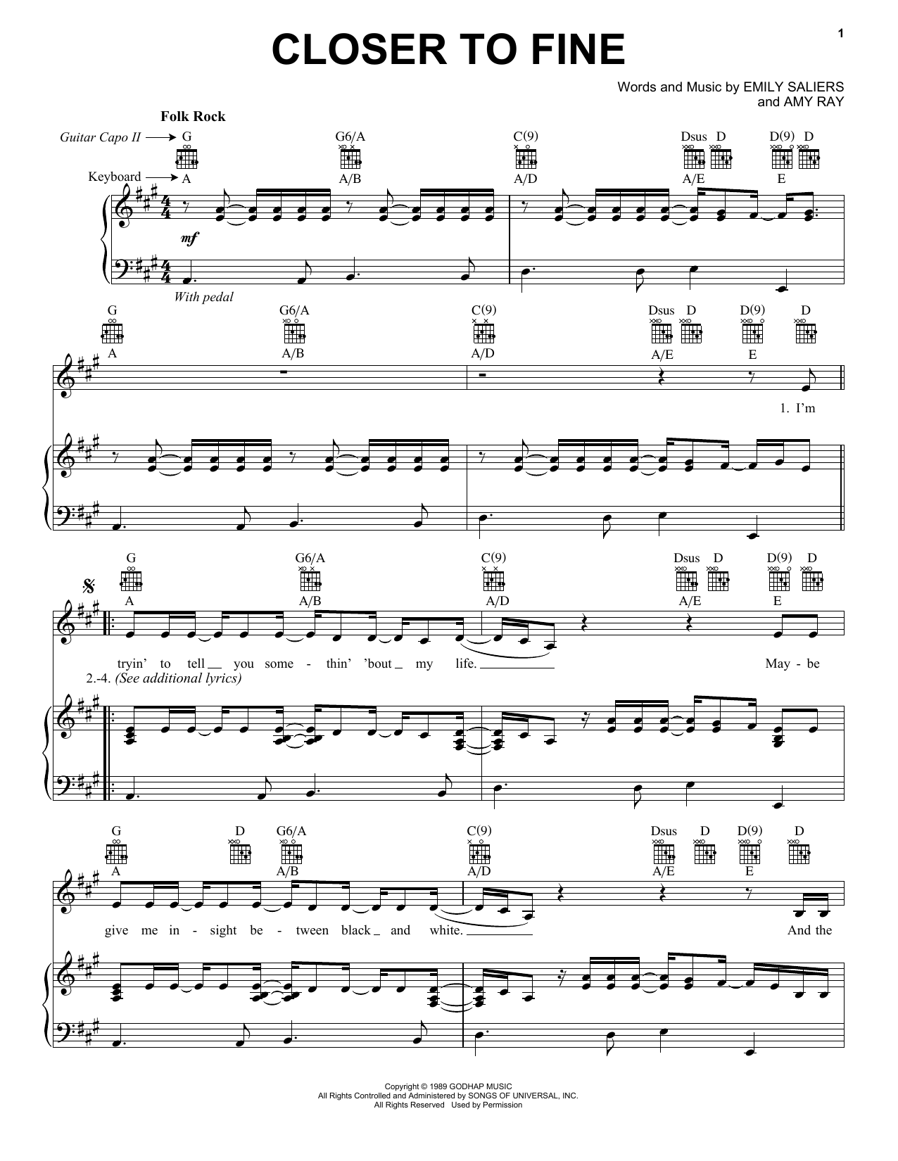 Download or print Indigo Girls Closer To Fine sheet music, chords and digital score arranged for Piano, Vocal & Guitar Chords (Right-Hand Melody). This Folk score includes 6 page(s).