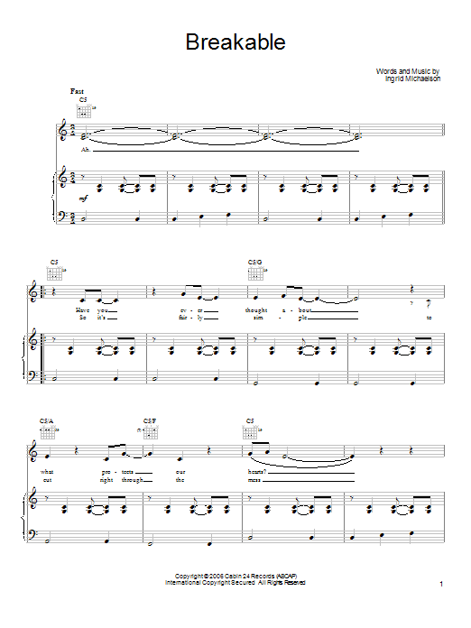 Download or print Ingrid Michaelson Breakable sheet music, chords and digital score arranged for Very Easy Piano. This Rock score includes 7 page(s).