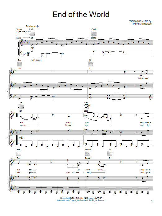 Download or print Ingrid Michaelson End Of The World sheet music, chords and digital score arranged for Piano, Vocal & Guitar Chords (Right-Hand Melody). This Pop score includes 5 page(s).