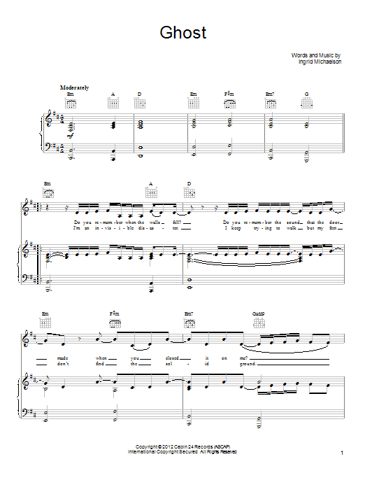 Download or print Ingrid Michaelson Ghost sheet music, chords and digital score arranged for Piano, Vocal & Guitar Chords (Right-Hand Melody). This Alternative score includes 5 page(s).