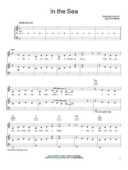 Download or print Ingrid Michaelson In The Sea sheet music, chords and digital score arranged for Piano, Vocal & Guitar Chords (Right-Hand Melody). This Pop score includes 6 page(s).