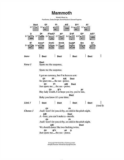 Download or print Interpol Mammoth sheet music, chords and digital score arranged for Guitar Chords/Lyrics. This Rock score includes 3 page(s).