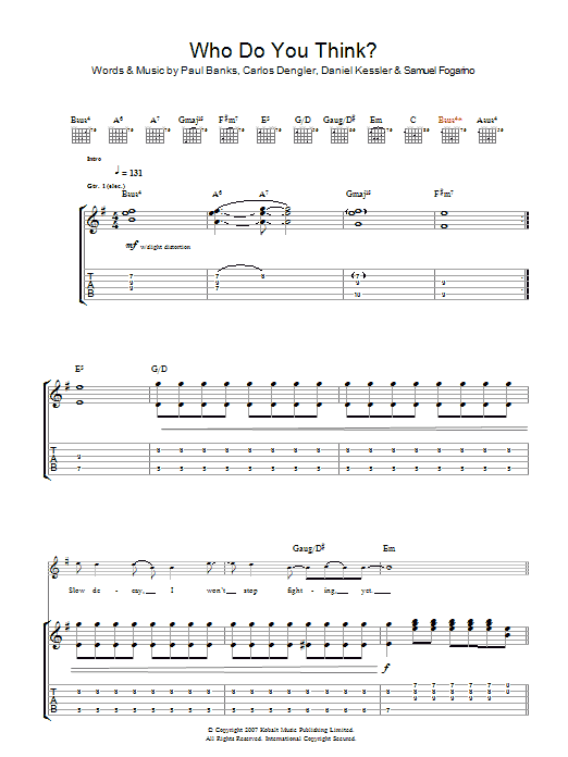 Download or print Interpol Who Do You Think sheet music, chords and digital score arranged for Guitar Tab. This Rock score includes 10 page(s).
