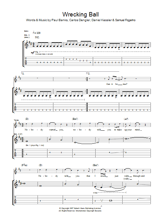 Download or print Interpol Wrecking Ball sheet music, chords and digital score arranged for Guitar Tab. This Rock score includes 5 page(s).