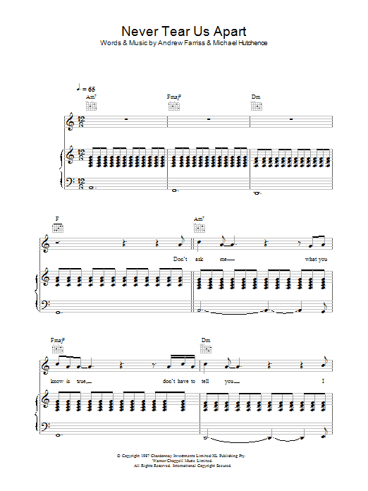 Download or print INXS Never Tear Us Apart sheet music, chords and digital score arranged for Easy Piano. This Pop score includes 5 page(s).